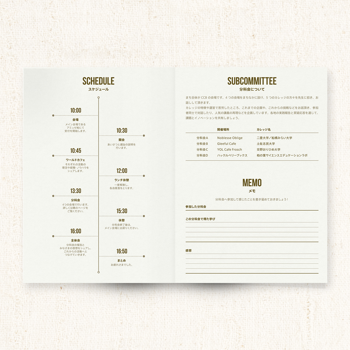 「学び」がテーマのフォーラムのため、ノートをイメージしたデザインです。感想を書き込むスペースなどを設け、ノートのように使えるパンフレットにしました。
